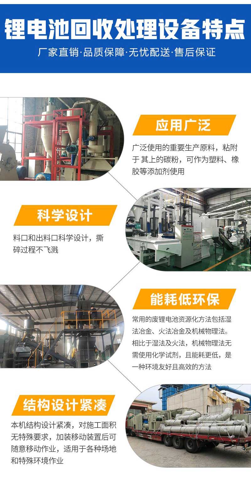 廢手機(jī)鋰電池回收處理設(shè)備主要采用物理回收方法,輔以“三廢”處置措施,具有綠色低碳、節(jié)能環(huán)保、無(wú)二次污染等特點(diǎn),并兼顧經(jīng)濟(jì)與環(huán)保效益,既實(shí)現(xiàn)有價(jià)組分的利用,又可對(duì)有害組分無(wú)害化處理。整個(gè)回收過(guò)程全部實(shí)現(xiàn)了工業(yè)自動(dòng)化,回收效率高,處理能力強(qiáng),每小時(shí)處理量為500千克,年處理量達(dá)到5000噸,廢舊鋰電池有價(jià)組分回收利用率達(dá)90%以上。