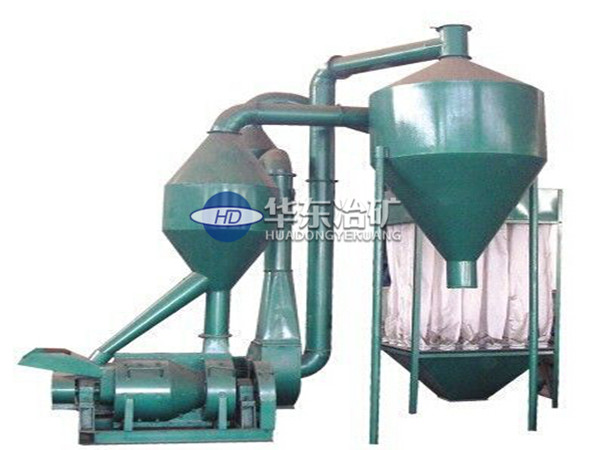 物料從進(jìn)料口傾斜角度不斷加料至排粉碎腔內(nèi),經(jīng)道打板不斷反復(fù)機(jī)打至耐磨襯板形成反復(fù)碰撞和機(jī)打過(guò)程,在機(jī)打過(guò)程尺寸縮小的物料會(huì)在高壓氣流帶動(dòng)下進(jìn)入第二排細(xì)碎打板的粉碎腔進(jìn)行二次碰撞和機(jī)打,經(jīng)高壓氣流帶入第三排送料打板輔助下順著高壓氣流直接到達(dá)細(xì)度分析器,達(dá)標(biāo)細(xì)度的物料經(jīng)風(fēng)力輸送管道進(jìn)入旋風(fēng)除塵簡(jiǎn)體內(nèi)進(jìn)行除塵和出料,未達(dá)標(biāo)的物料將由細(xì)度分析器返料管道進(jìn)入入料口反復(fù)機(jī)打至尺寸達(dá)標(biāo),本機(jī)配備有細(xì)度控制裝置,在風(fēng)機(jī)上方客戶可根據(jù)自身細(xì)度需要調(diào)整。